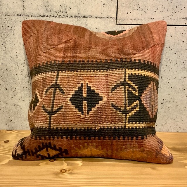 何十年も前に織られたオールドキリムの状態の良い部分をカットして、キリムのクッションカバーにしました。何回も洗い、日に当ててこそ出てくる色合い風合いに趣きを感じます。ソファーにいくつか並べてお洒落にディスプレイしてみてはいかがでしょう。 初めてキリムを手にされる方には、チクチクするという感触があるかもしれません。感じ方には個人差がありますが、それがキリムの風合いという事をご理解下さいませ。チクチク感が気になるという方には、使い方としまして頭や顔をつけるときには滑らかな肌触りの裏地を、インテリアとして楽しまれる時にはキリム面を出してご使用されることをご提案いたします。 また、写真撮影には十分気を使っておりますが、見え方により実物と多少の相違があるものもございます事をご容赦ください。 ※お手入※ご家庭でお洗濯が可能です。その際、お湯は使用せず水で洗って下さい。洗濯機を使用する場合、ネットに入れて手洗いコースをお勧めします。 乾燥機は避け自然乾燥をしてください。 ウール用の洗剤で優しく洗って下さいね。 ※別売りでクッションの中身も販売しています。 【素材】 キリム:ウール 裏地:コットン 【サイズ】 40×40㎝ 【原産国】 トルコ