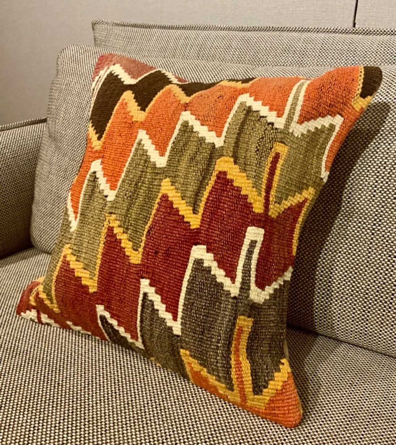 何十年も前に織られたオールドキリムの状態の良い部分をカットして、キリムのクッションカバーにしました。何回も洗い、日に当ててこそ出てくる色合い風合いに趣きを感じます。ソファーにいくつか並べてお洒落にディスプレイしてみてはいかがでしょう。