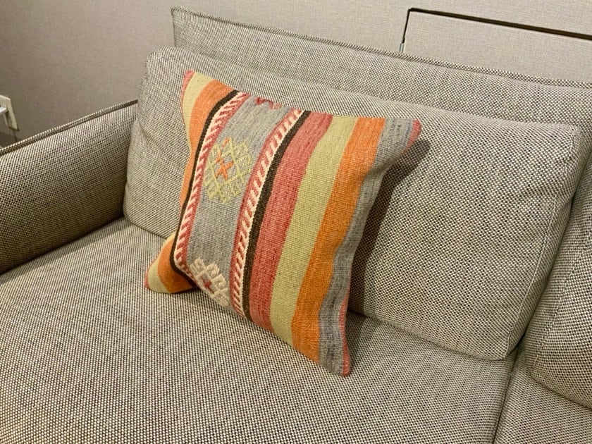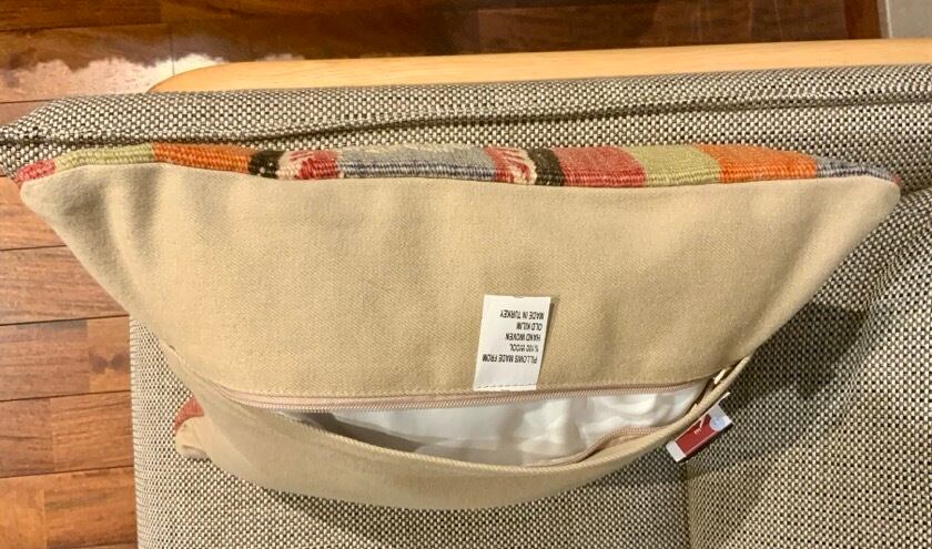 初めてキリムを手にされる方には、チクチクするという感触があるかもしれません。感じ方には個人差がありますが、それがキリムの風合いという事をご理解下さいませ。チクチク感が気になるという方には、使い方としまして頭や顔をつけるときには滑らかな肌触りの裏地を、インテリアとして楽しまれる時にはキリム面を出してご使用されることをご提案いたします。