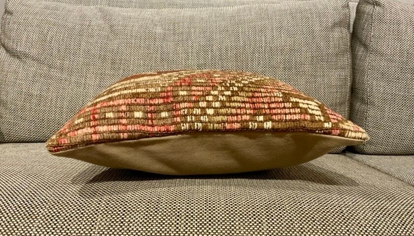 何十年も前に織られたオールドキリムの状態の良い部分をカットして、キリムのクッションカバーにしました。何回も洗い、日に当ててこそ出てくる色合い風合いに趣きを感じます。ソファーにいくつか並べてお洒落にディスプレイしてみてはいかがでしょう。