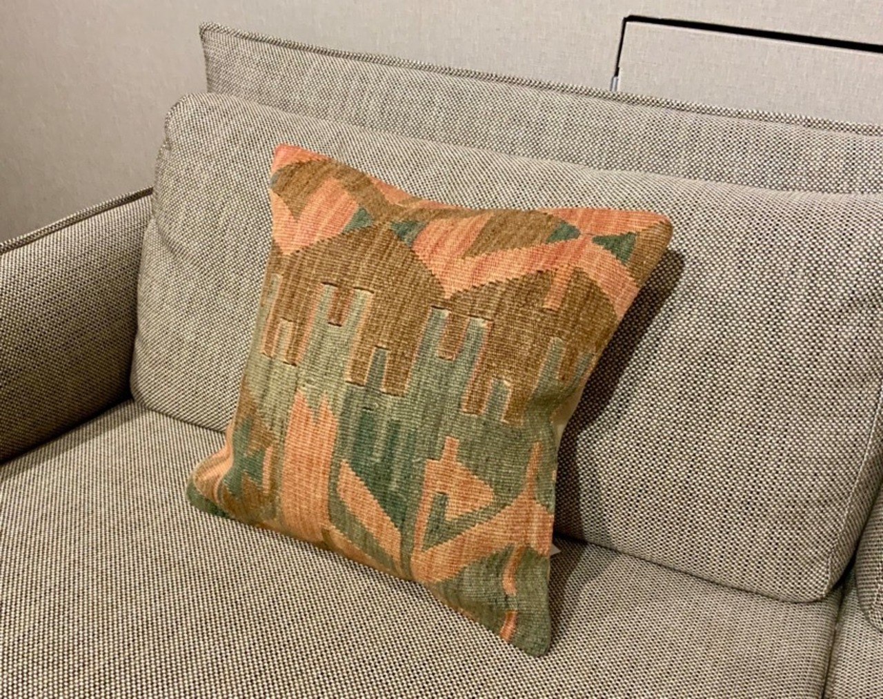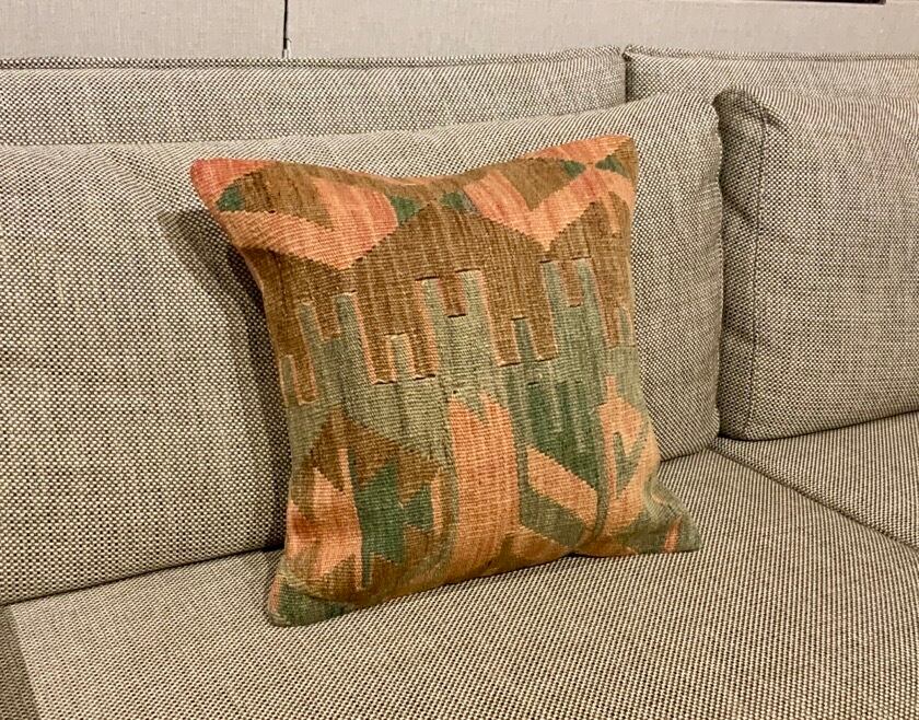 何十年も前に織られたオールドキリムの状態の良い部分をカットして、キリムのクッションカバーにしました。何回も洗い、日に当ててこそ出てくる色合い風合いに趣きを感じます。ソファーにいくつか並べてお洒落にディスプレイしてみてはいかがでしょう。