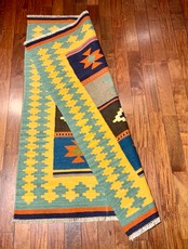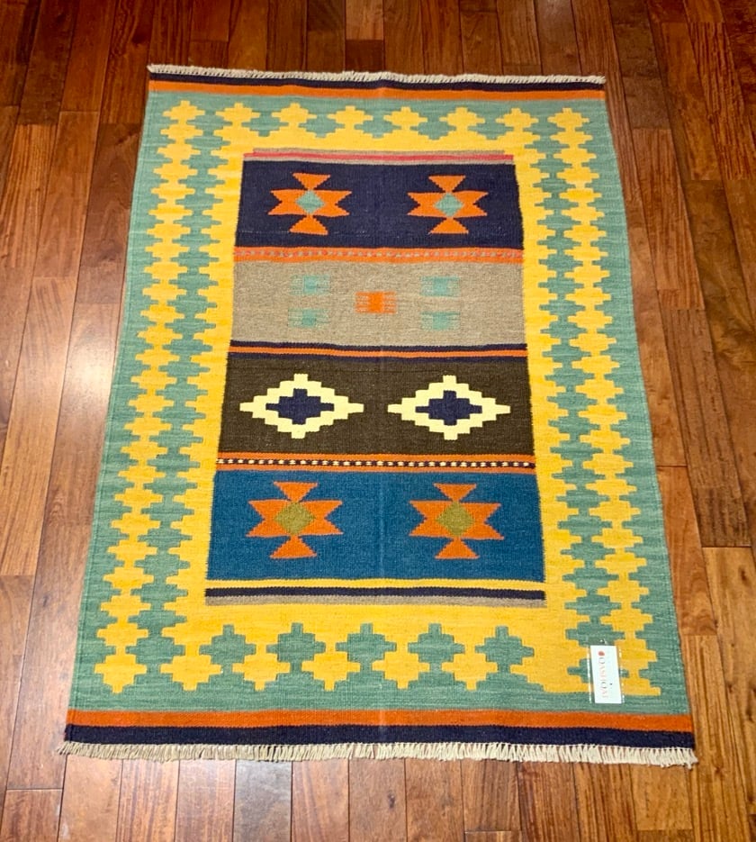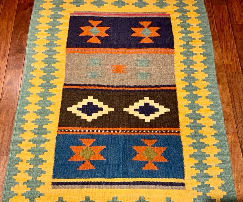 イランカシュガイ族が草木染・手織りで織り上げる平織のキリムです。遊牧民にとってキリムは穀物袋やラクダの背中に乗せる袋など生活用具を作る生地としての役割があり、家族の幸せを願うデザインが施されています。