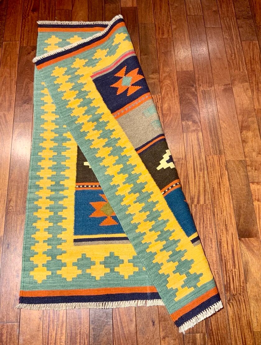 【お手入】 普段のお手入れは掃除機をかけるだけで十分です。また、天気の良い場所に干したり、敷き場所や方向など定期的に変えたりする事も長持ちの秘訣です。汚れが気になったら水洗いもできます。その際は、お湯を使わず水で洗って下さい。夏に屋外で洗う場合、ホースに残っている水は熱くなっていますので、水の温度になってから洗って下さい。ご自分で洗うのが大変だという方には、専門店でのクリーニングをお勧めします。当店でも承りますのでご相談ください。また、長期間使用しないまま保管される場合は、汚れをとり、湿気のない風通しの良い場所に保管して下さい。手織りの絨毯、キリムはお手入れ次第で一生あるいは次の世代まで受け継いでいただけます。