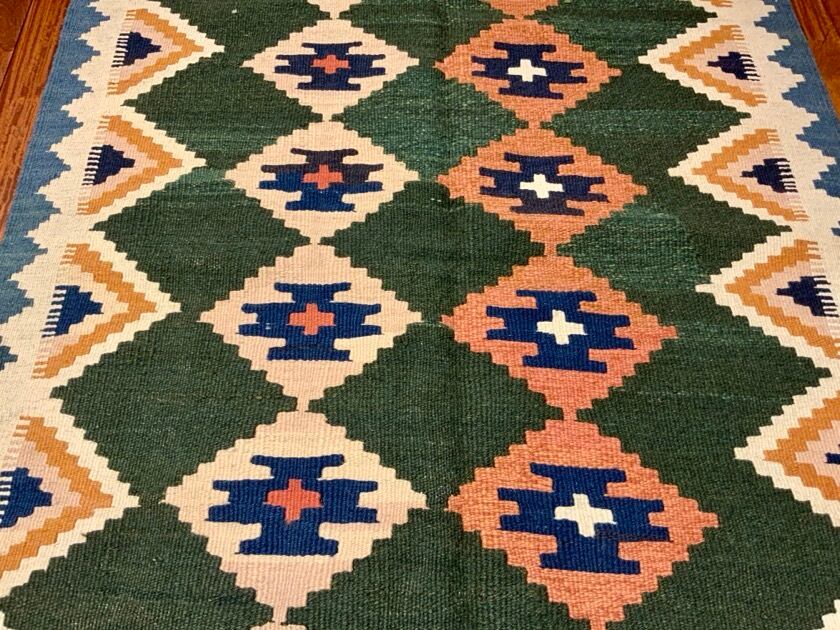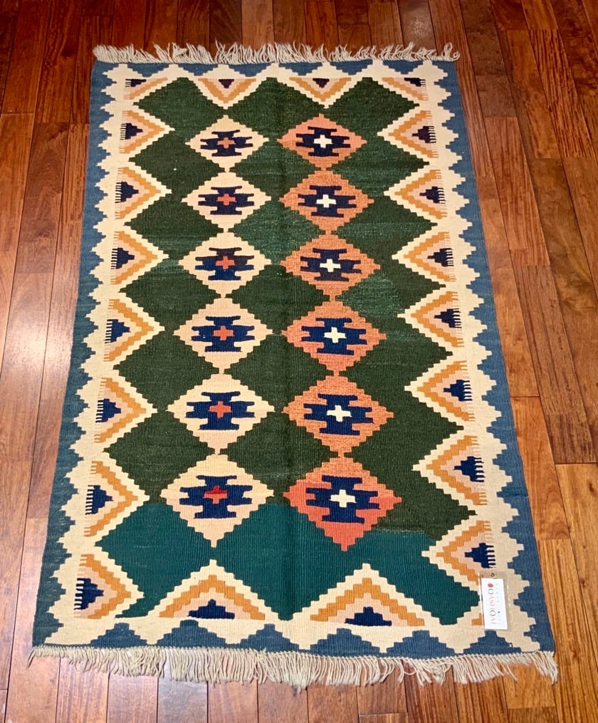 イランカシュガイ族が草木染・手織りで織り上げる平織のキリムです。遊牧民にとってキリムは穀物袋やラクダの背中に乗せる袋など生活用具を作る生地としての役割があり、家族の幸せを願うデザインが施されています。
