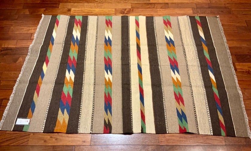 イランカシュガイ族が草木染・手織りで織り上げる平織のキリムです。遊牧民にとってキリムは穀物袋やラクダの背中に乗せる袋など生活用具を作る生地としての役割があり、家族の幸せを願うデザインが施されています。