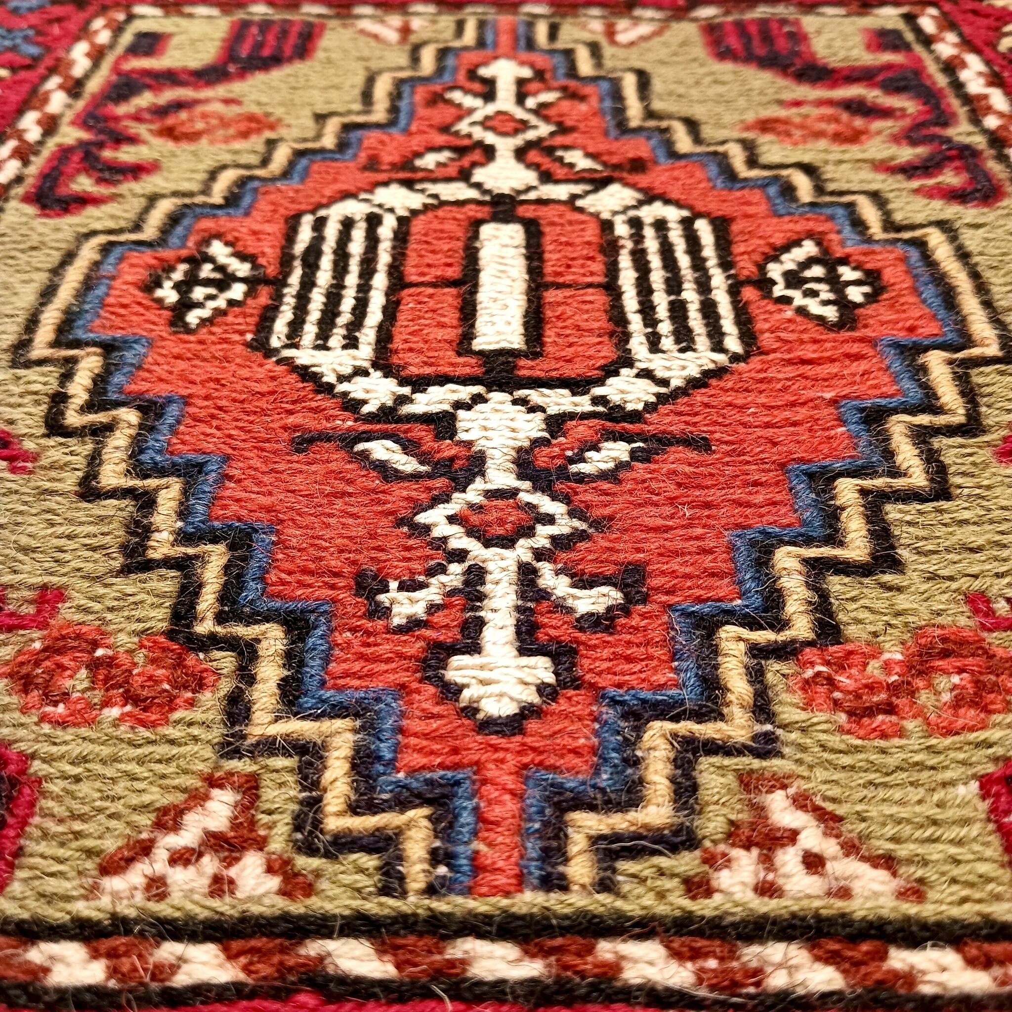 文様には幾何学模様、生命の樹、鳥や動物など象徴的なモチーフが多く、地域ごとの文化や信仰が反映されています。堅牢で摩耗に強いため袋物、敷物、サドルバッグなど生活道具に用いられてきました。近年では美術性の高さから工芸品としても評価が高まり、伝統技術を守る織り手たちによって継承されています。