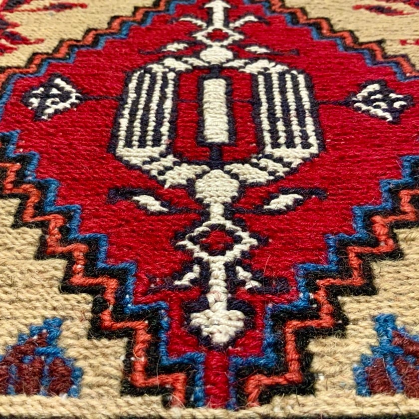 文様には幾何学模様、生命の樹、鳥や動物など象徴的なモチーフが多く、地域ごとの文化や信仰が反映されています。堅牢で摩耗に強いため袋物、敷物、サドルバッグなど生活道具に用いられてきました。近年では美術性の高さから工芸品としても評価が高まり、伝統技術を守る織り手たちによって継承されています。
