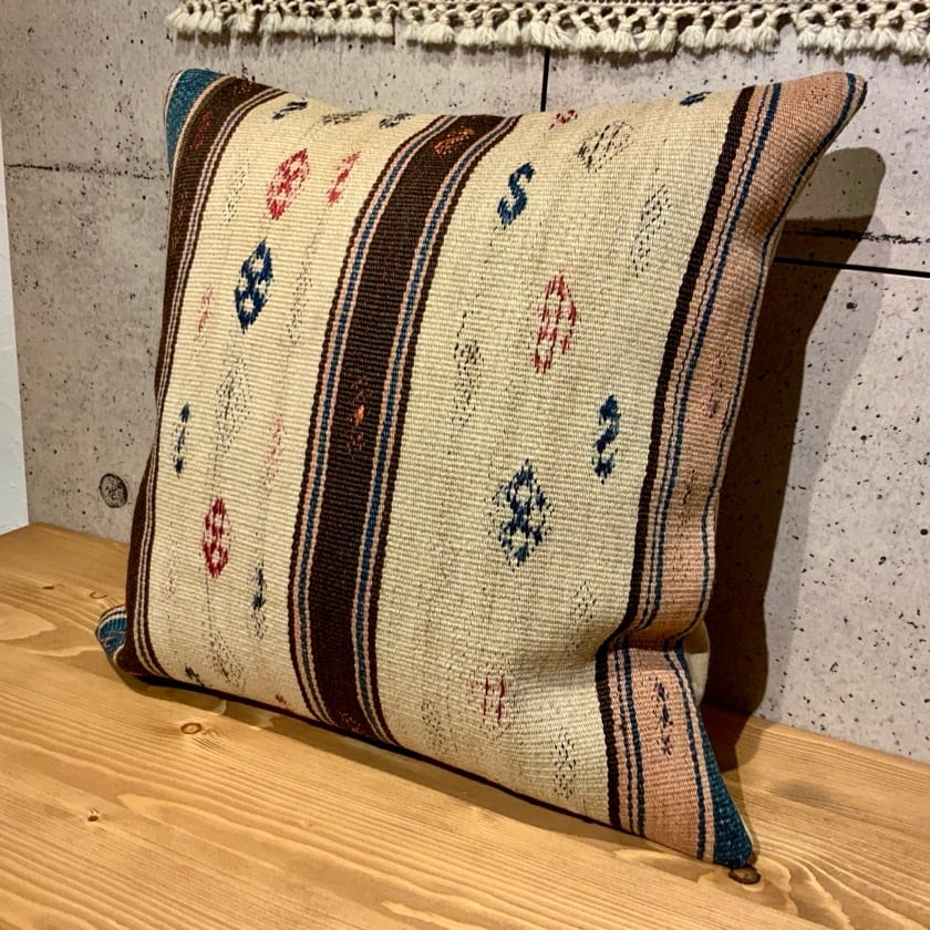 何十年も前に織られたオールドキリムの状態の良い部分をカットしてキリムのクッションカバーにしました。何回も洗い、日に当ててこそ出てくる色合い風合いに趣きを感じます。こソファーにいくつか並べてお洒落にディスプレイしてみてはいかがでしょう。