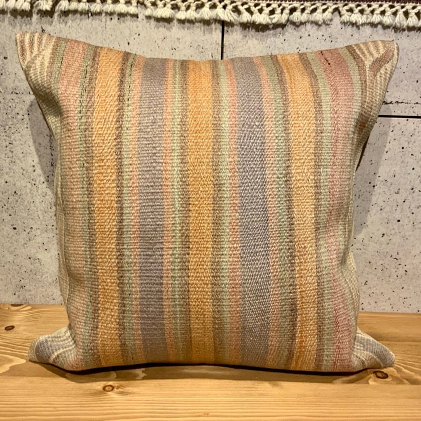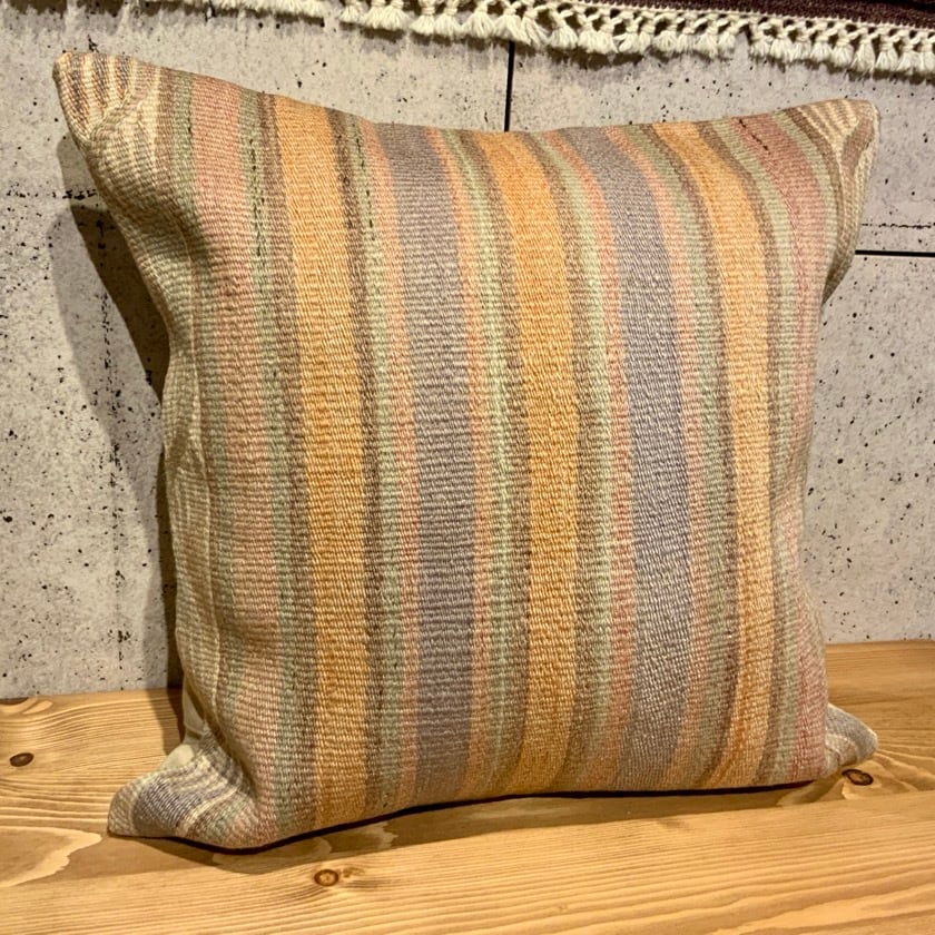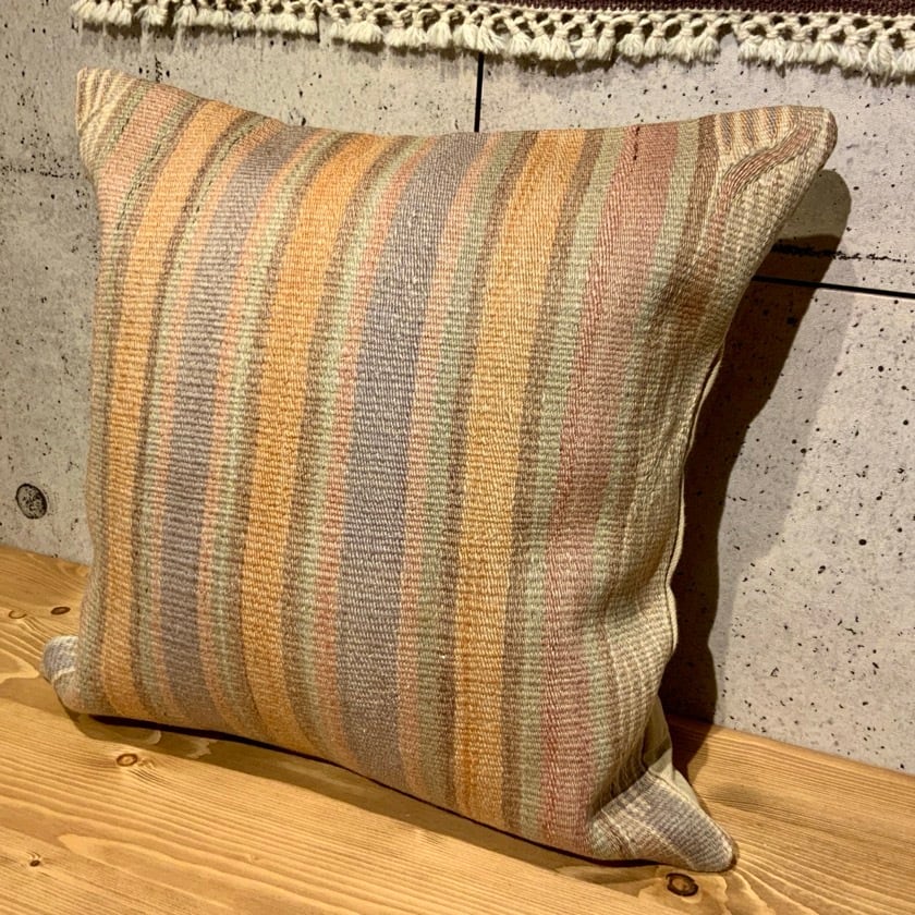 何十年も前に織られたオールドキリムの状態の良い部分をカットしてキリムのクッションカバーにしました。何回も洗い、日に当ててこそ出てくる色合い風合いに趣きを感じます。こソファーにいくつか並べてお洒落にディスプレイしてみてはいかがでしょう。