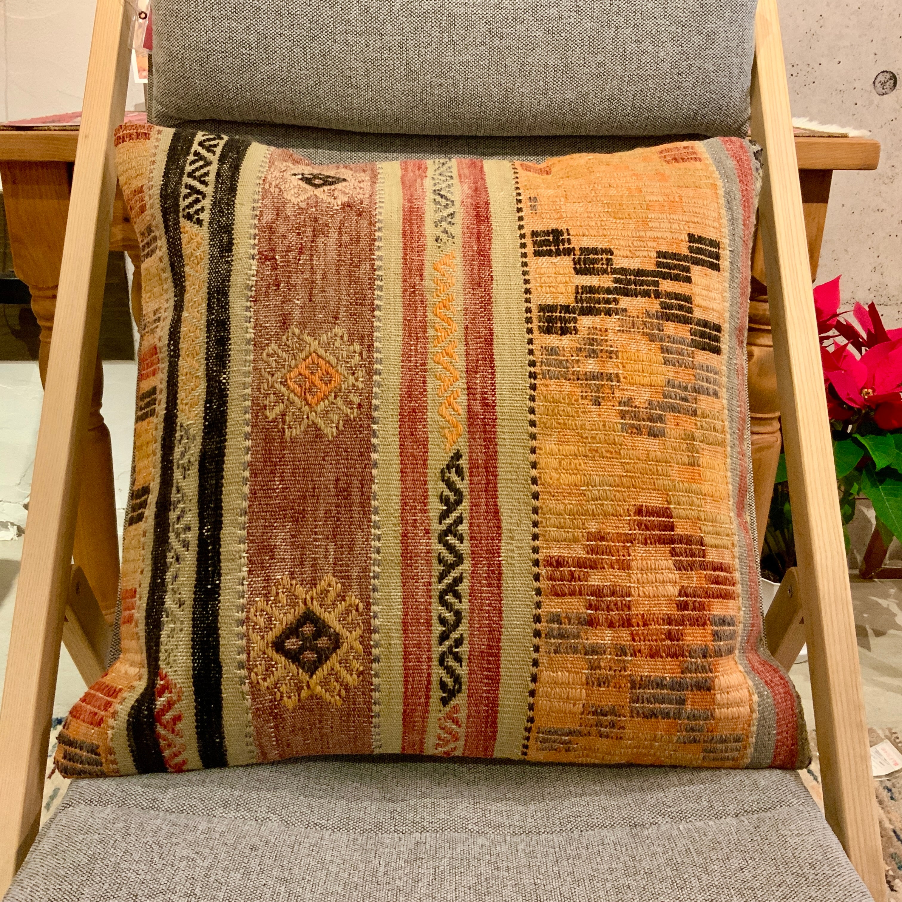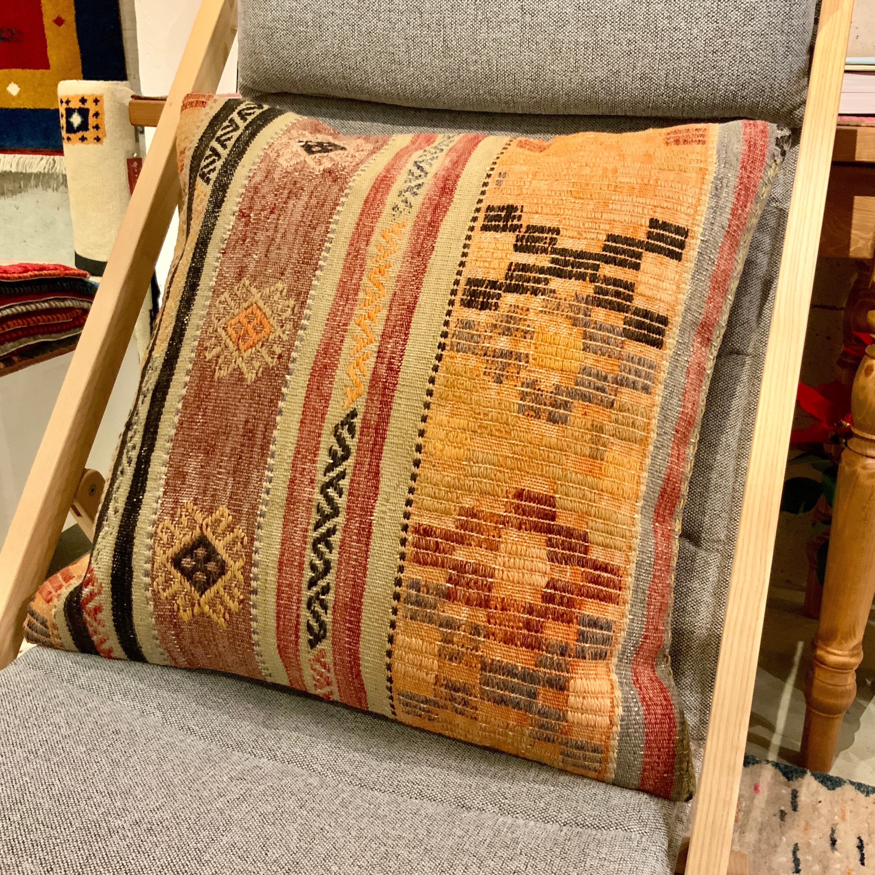 何十年も前に織られたオールドキリムの状態の良い部分をカットしてキリムのクッションカバーにしました。何回も洗い、日に当ててこそ出てくる色合い風合いに趣きを感じます。こソファーにいくつか並べてお洒落にディスプレイしてみてはいかがでしょう。