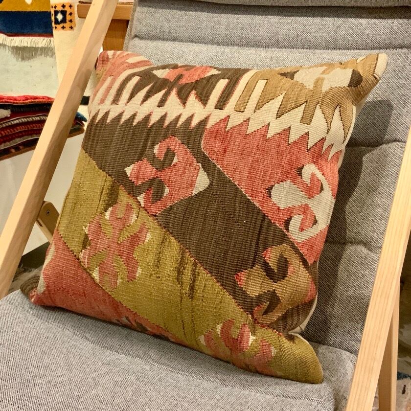 何十年も前に織られたオールドキリムの状態の良い部分をカットして、キリムのクッションカバーにしました。何回も洗い、日に当ててこそ出てくる色合い風合いに趣きを感じます。ソファーにいくつか並べてお洒落にディスプレイしてみてはいかがでしょう。