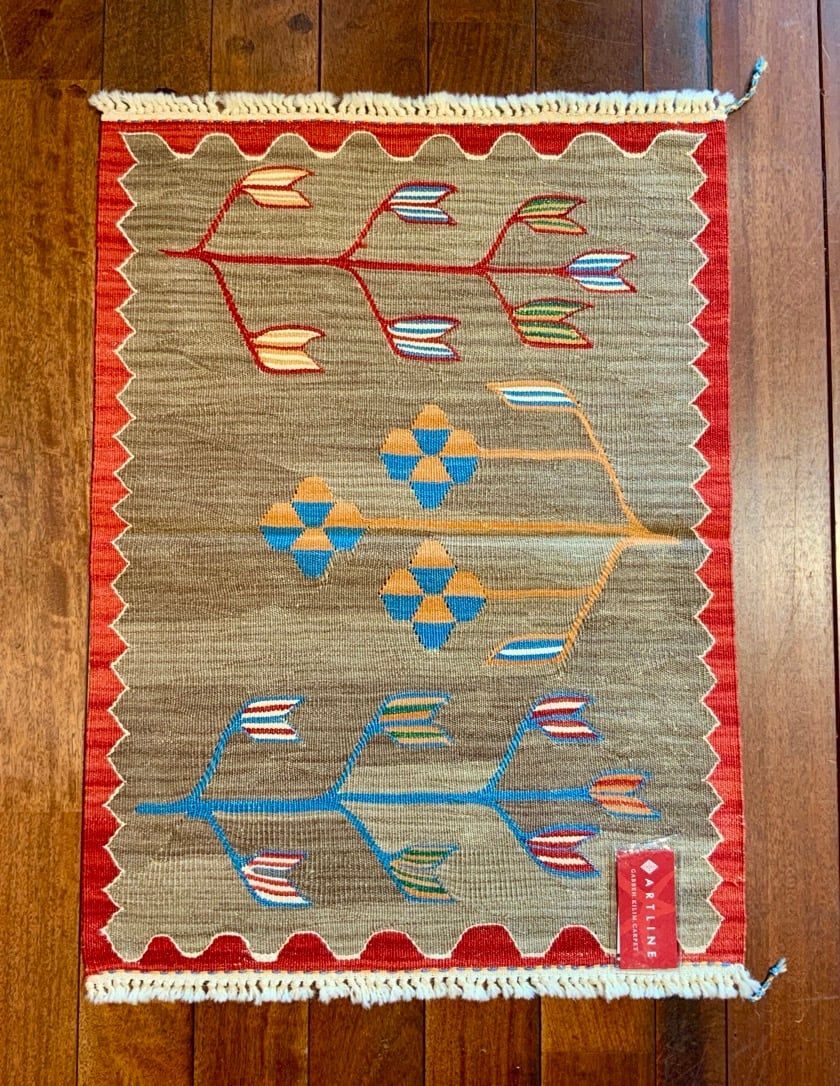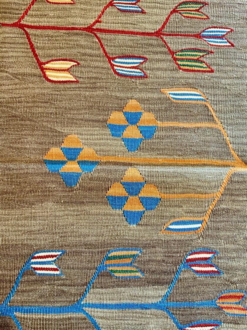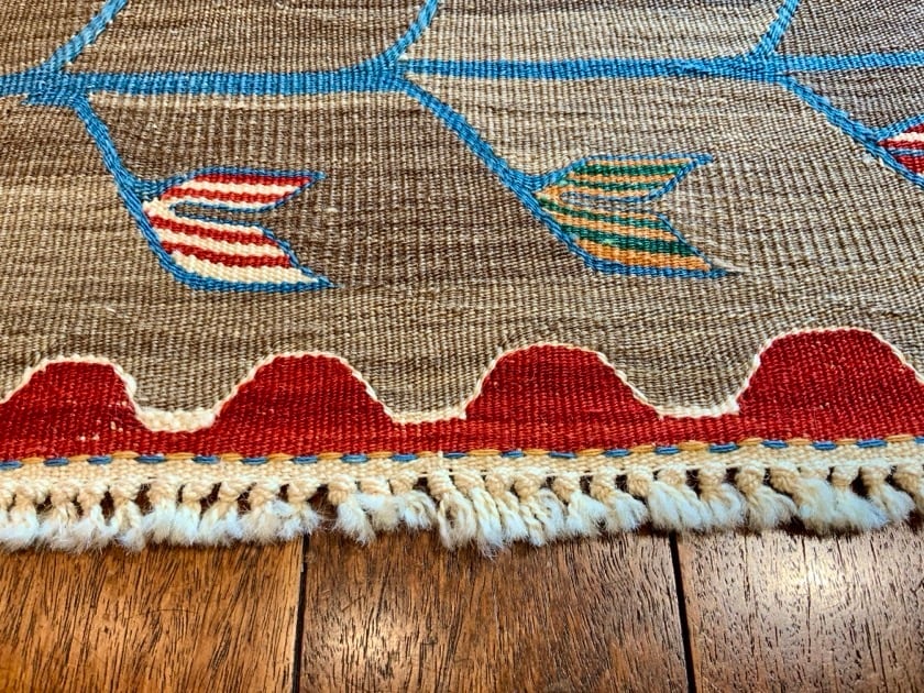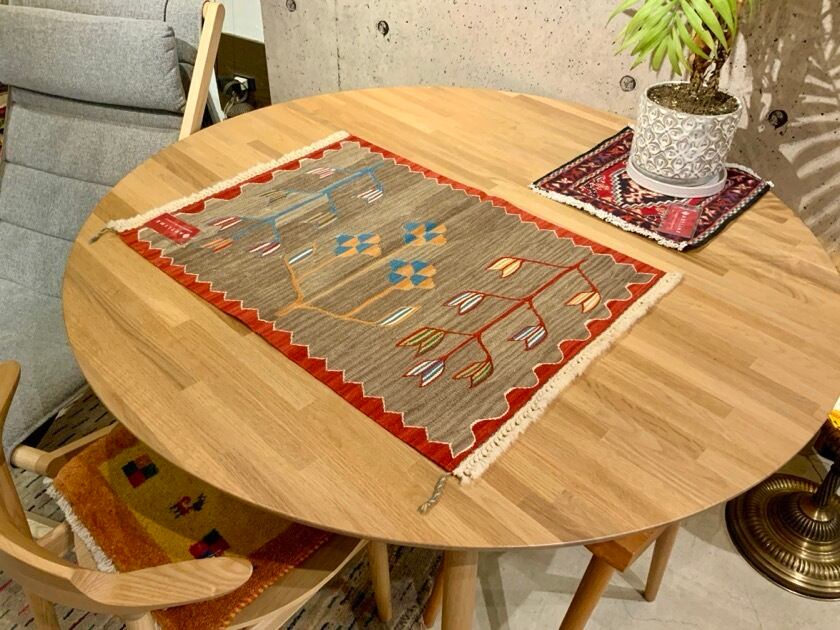 こちらのキリムはトルコにある、アートラインの自社工房で織ったキリムです。アンゴラ羊の毛と子羊の毛を混ぜた手紬の糸で織りあげるため、とてもしなやかなキリムに仕上がります。