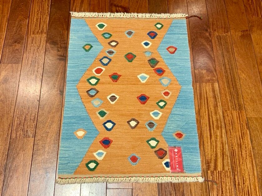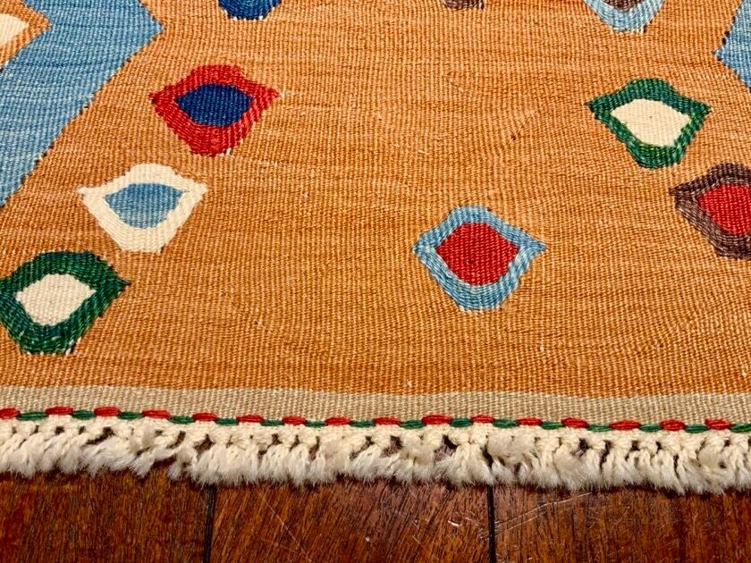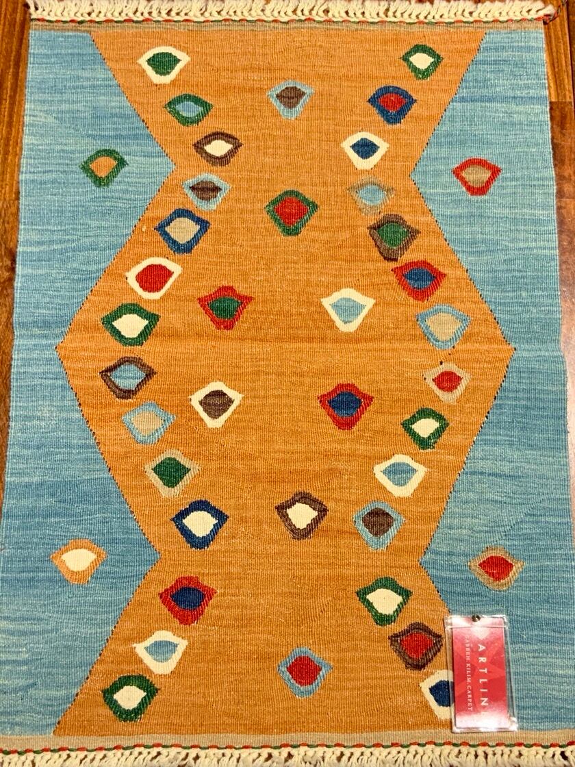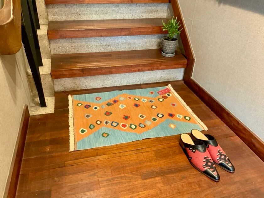 こちらのキリムはトルコにある、アートラインの自社工房で織ったキリムです。アンゴラ羊の毛と子羊の毛を混ぜた手紬の糸で織りあげるため、とてもしなやかなキリムに仕上がります。