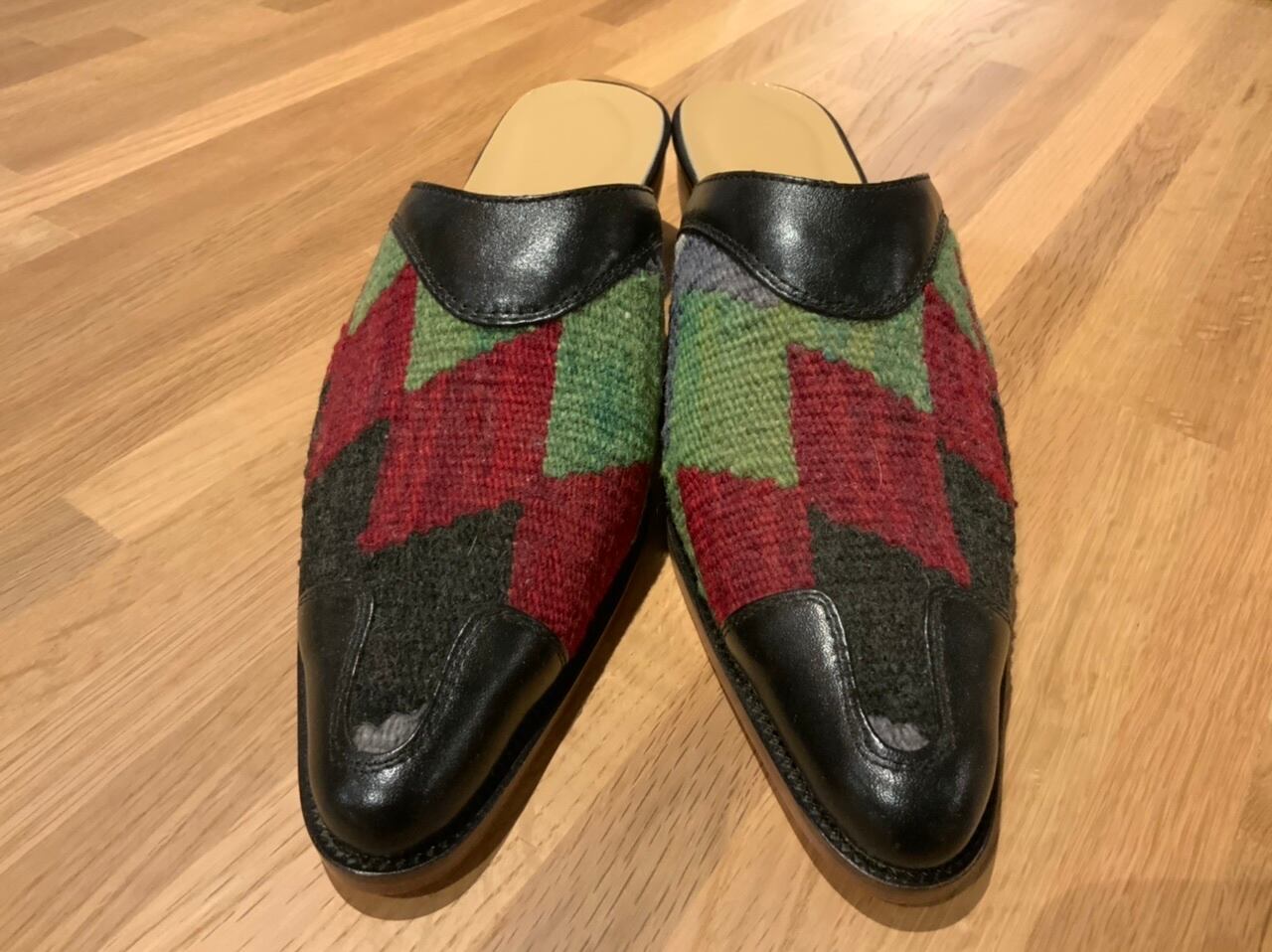 約30年前以上に草木染め、手織りされたオールドキリムと本革を素材とした靴です。