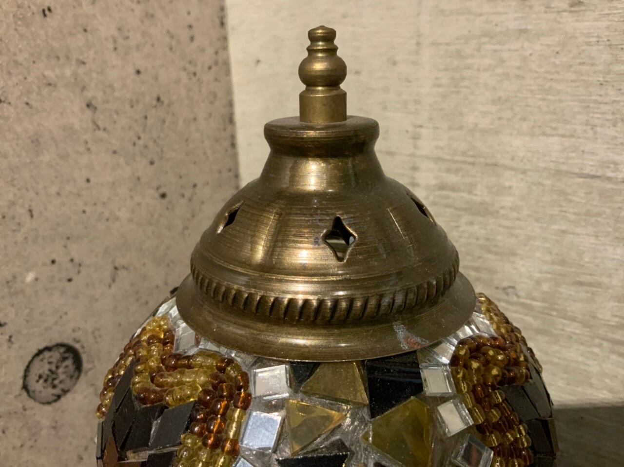 オスマン帝国時代に宮殿やモスクなどで使われていた伝統的なモザイク模様のガラスのランプです。テーブルの上などに飾って頂けるスタンドタイプとなっています。透明な球体のガラスにカットした色ガラスとビーズを手作業で貼りデザインしています。暗いお部屋でモザイクランプに明かりをつけるとカラフルなデザインが部屋中に広がってオリエンタルムードをお楽しみいただけます。