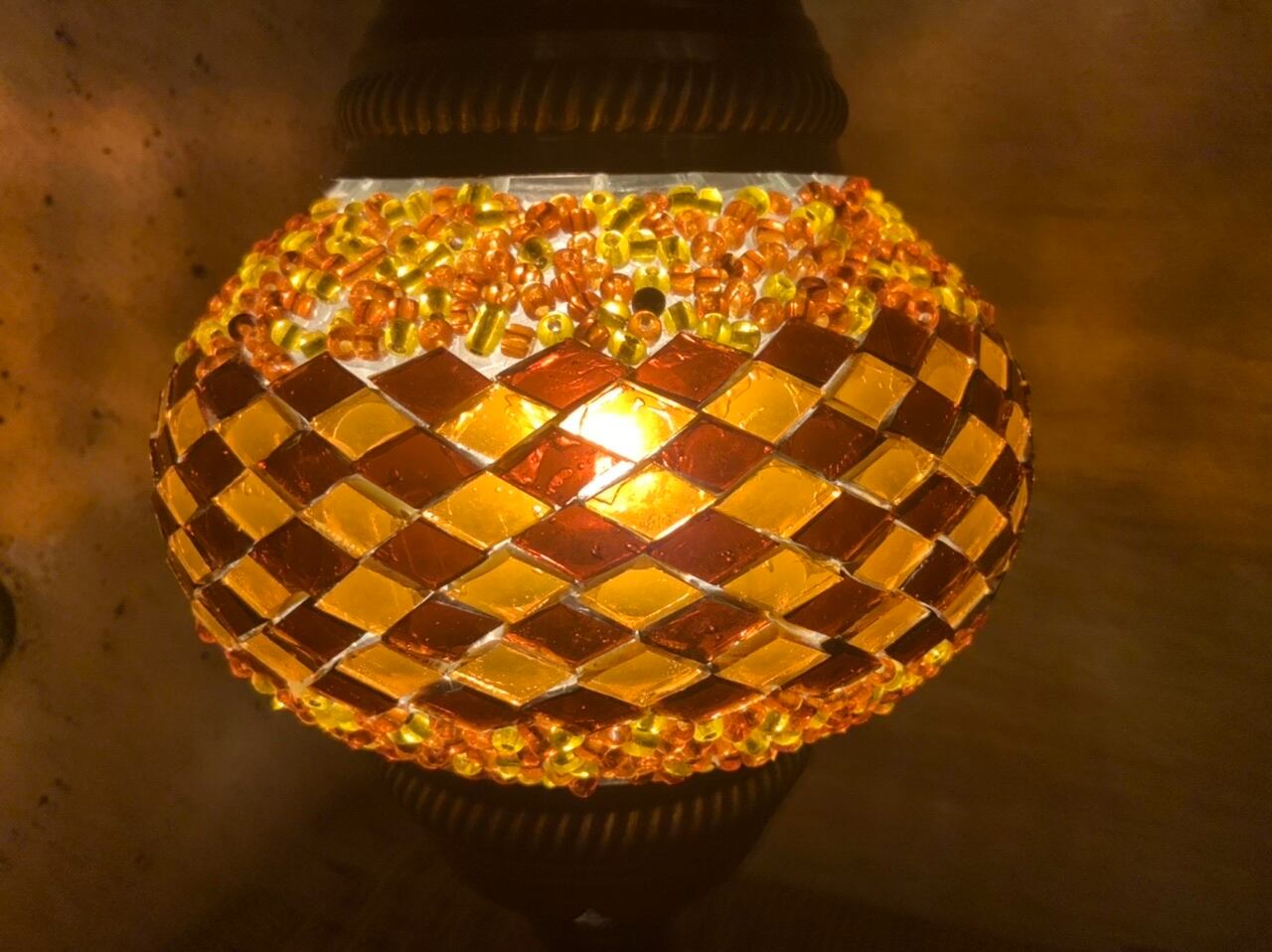 オスマン帝国時代に宮殿やモスクなどで使われていた伝統的なモザイク模様のガラスのランプです。テーブルの上などに飾って頂けるスタンドタイプとなっています。透明な球体のガラスにカットした色ガラスとビーズを手作業で貼りデザインしています。暗いお部屋でモザイクランプに明かりをつけるとカラフルなデザインが部屋中に広がってオリエンタルムードをお楽しみいただけます。