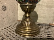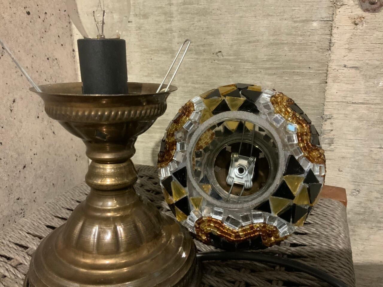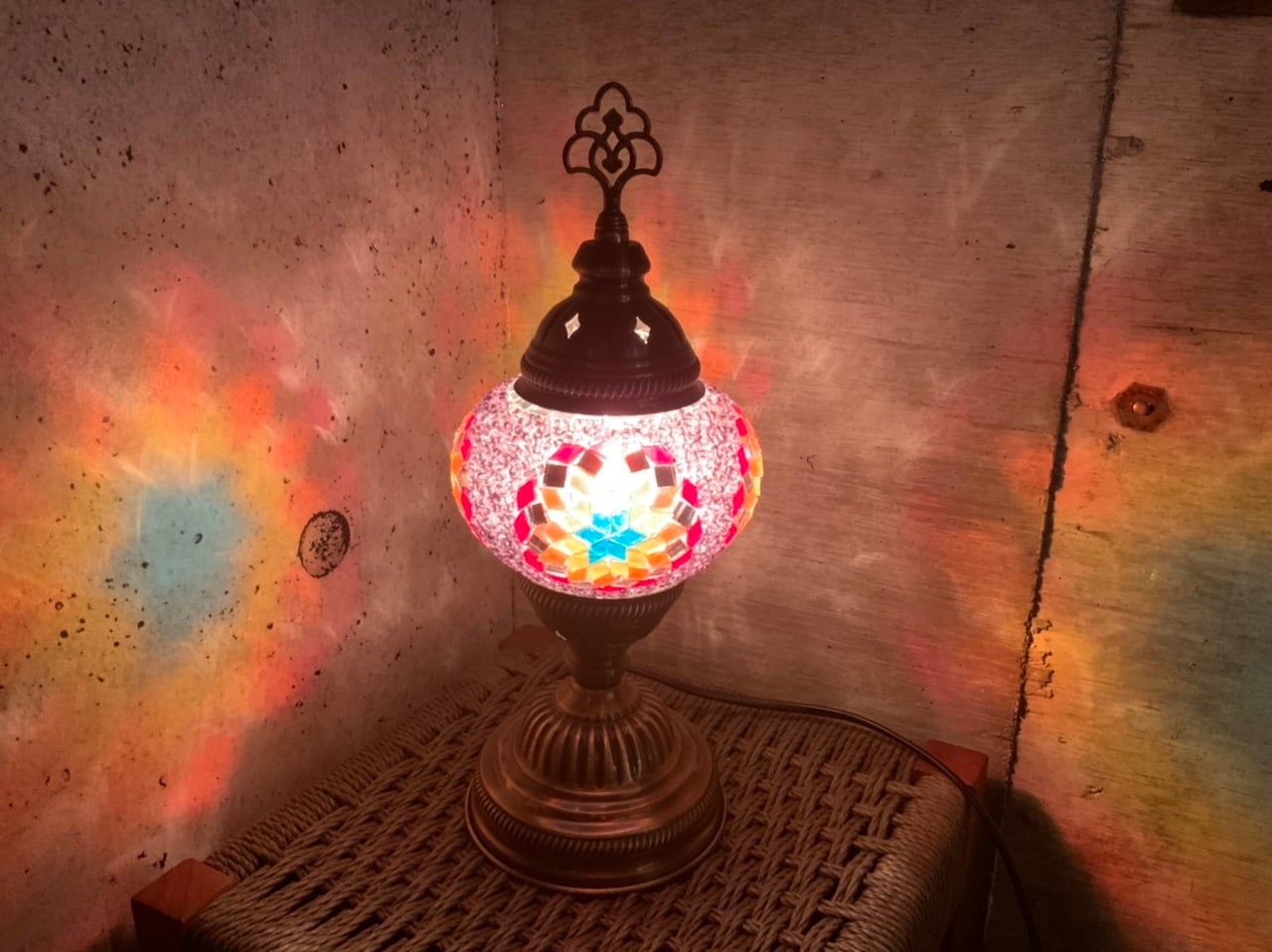 オスマン帝国時代に宮殿やモスクなどで使われていた伝統的なモザイク模様のガラスのランプです。テーブルの上などに飾って頂けるスタンドタイプとなっています。透明な球体のガラスにカットした色ガラスとビーズを手作業で貼りデザインしています。暗いお部屋でモザイクランプに明かりをつけるとカラフルなデザインが部屋中に広がってオリエンタルムードをお楽しみいただけます。