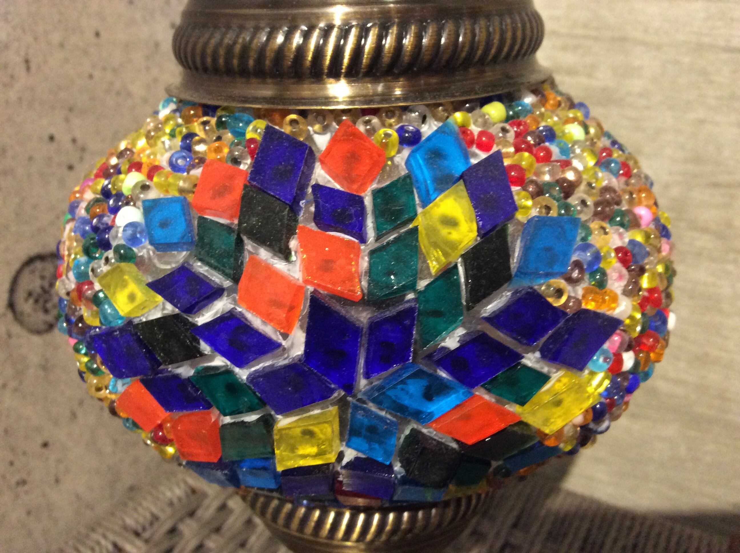 オスマン帝国時代に宮殿やモスクなどで使われていた伝統的なモザイク模様のガラスのランプです。テーブルの上などに飾って頂けるスタンドタイプとなっています。透明な球体のガラスにカットした色ガラスとビーズを手作業で貼りデザインしています。暗いお部屋でモザイクランプに明かりをつけるとカラフルな色合いが部屋中に広がってオリエンタルムードをお楽しみいただけます。