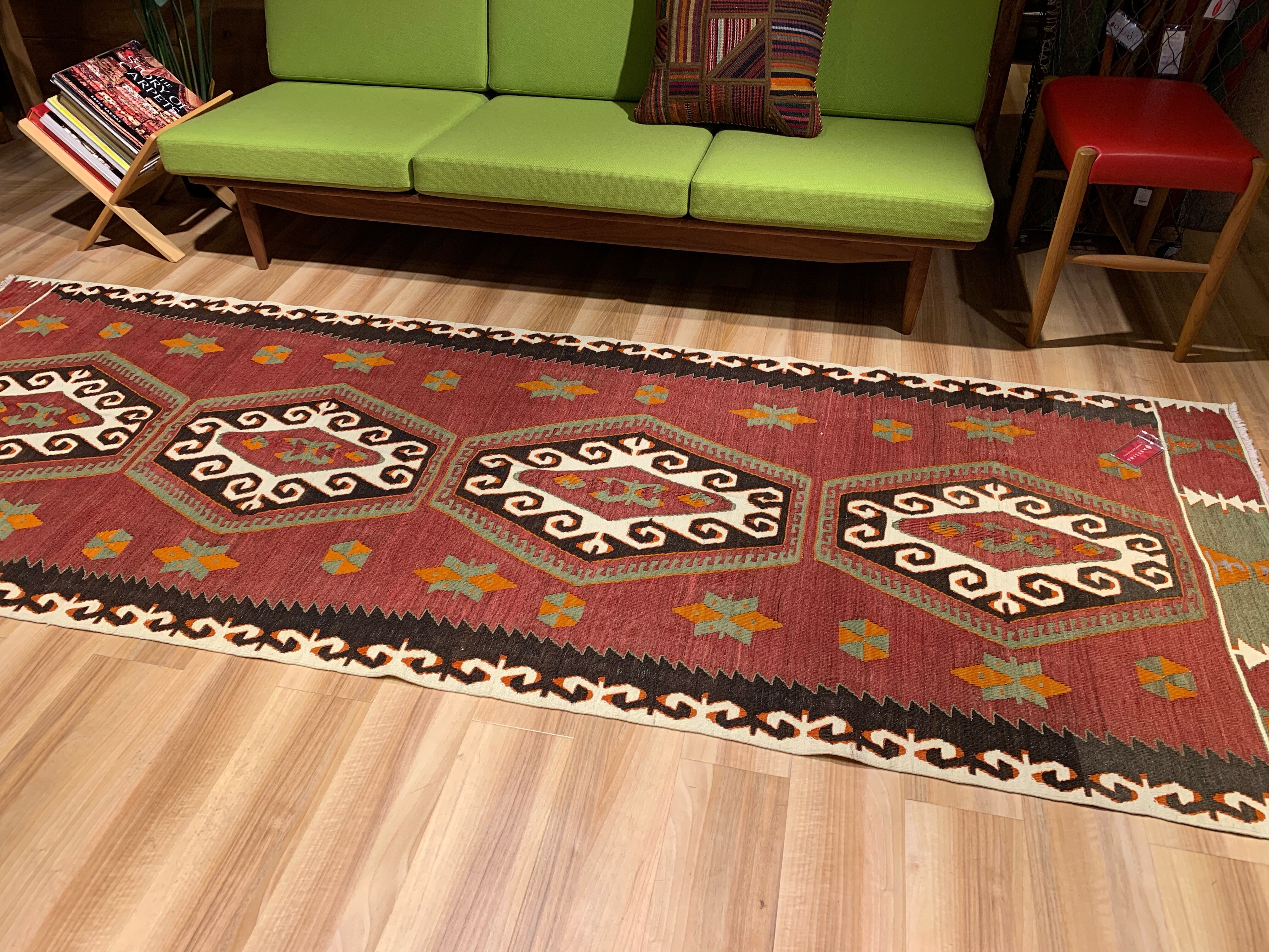 【お手入】 普段のお手入れは掃除機をかけるだけで十分です。天気の良い場所に干したり、敷き場所や方向など定期的に変えたりする事も長持ちの秘訣です。汚れが気になりクリーニングをお考えの場合には、専門店でのクリーニングをお勧めします。当店でも承りますのでご相談ください。また、長期間使用しないまま保管される場合は、汚れをとり、湿気のない風通しの良い場所に保管して下さい。手織りのキリムはお手入れ次第で一生あるいは次の世代まで受け継いでいただけます。