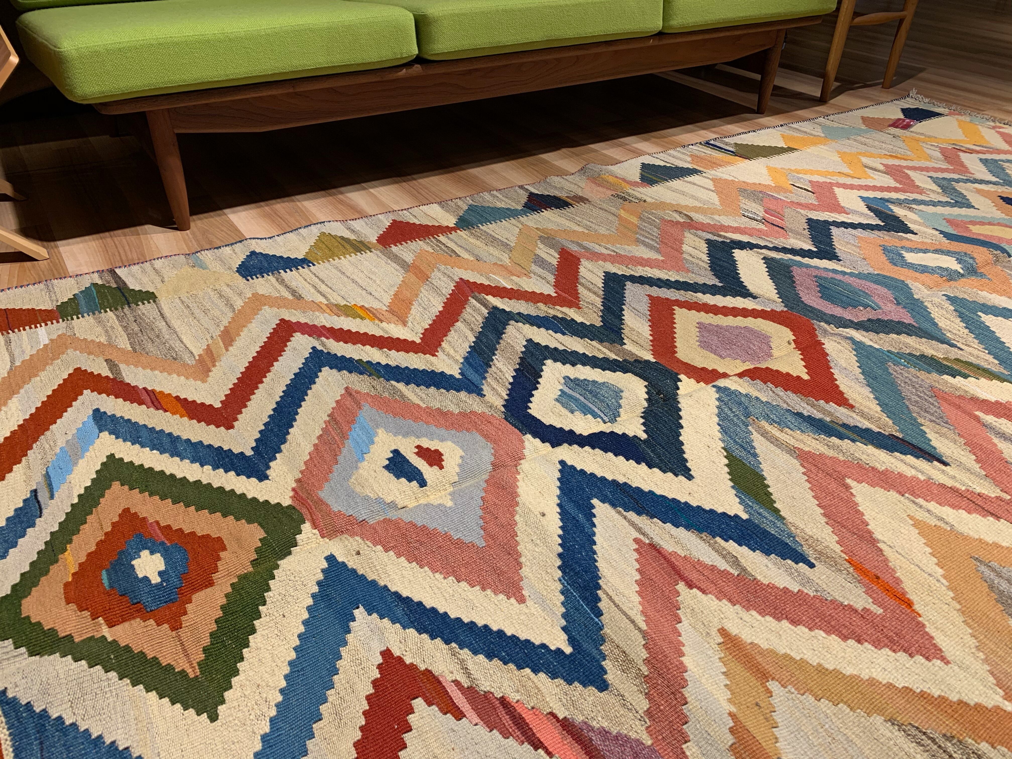 【お手入】 普段のお手入れは掃除機をかけるだけで十分です。天気の良い場所に干したり、敷き場所や方向など定期的に変えたりする事も長持ちの秘訣です。汚れが気になりクリーニングをお考えの場合には、専門店でのクリーニングをお勧めします。当店でも承りますのでご相談ください。また、長期間使用しないまま保管される場合は、汚れをとり、湿気のない風通しの良い場所に保管して下さい。手織りのキリムはお手入れ次第で一生あるいは次の世代まで受け継いでいただけます。