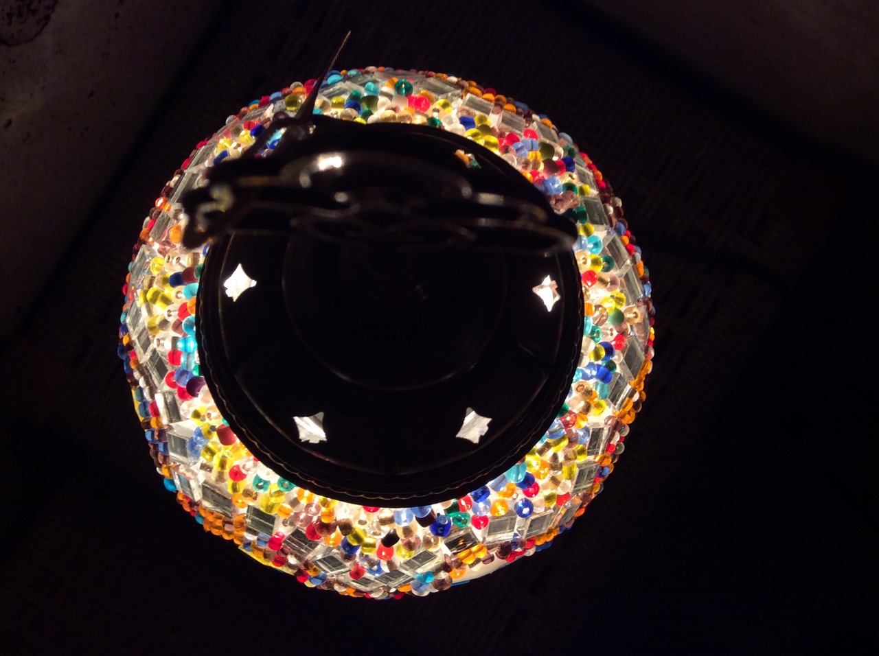 オスマン帝国時代に宮殿やモスクなどで使われていた伝統的なモザイク模様のガラスのランプです。テーブルの上などに飾って頂けるスタンドタイプとなっています。透明な球体のガラスにカットした色ガラスとビーズを手作業で貼りデザインしています。暗いお部屋でモザイクランプに明かりをつけると美しい色合いが部屋中に広がってオリエンタルムードをお楽しみいただけます。