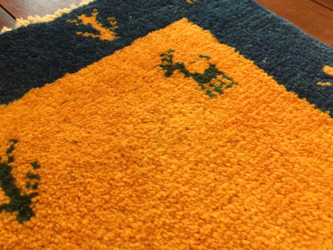 【お手入】 普段のお手入れは掃除機をかけるだけで十分です。使いはじめは遊び毛が出る事もありますが、使っていくうちに徐々に落ち着いてきます。また、天気の良い場所に干したり、敷き場所や方向など定期的に変えたりする事も長持ちの秘訣です。汚れが気になりクリーニングをお考えの場合、大きいサイズのギャッベですと水を含みかなりの重量になりますので、専門店でのクリーニングをお勧めしますが、このサイズでしたら自分で水洗いが出来そうです。その際は、お湯は使わずお水で洗って下さいね。ウール用の洗剤などで柔らかめのブラシで汚れを落として下さい。泡をしっかりと濯いだ後に水けをしっかりとって太陽の下で干して下さい。クリーニングに出される場合は当店でも承りますのでご相談ください。また、長期間使用しないまま保管される場合は、汚れをとり、湿気のない風通しの良い場所に保管して下さい。手織りの絨毯はお手入れ次第で一生あるいは次の世代まで受け継いでいただけます。