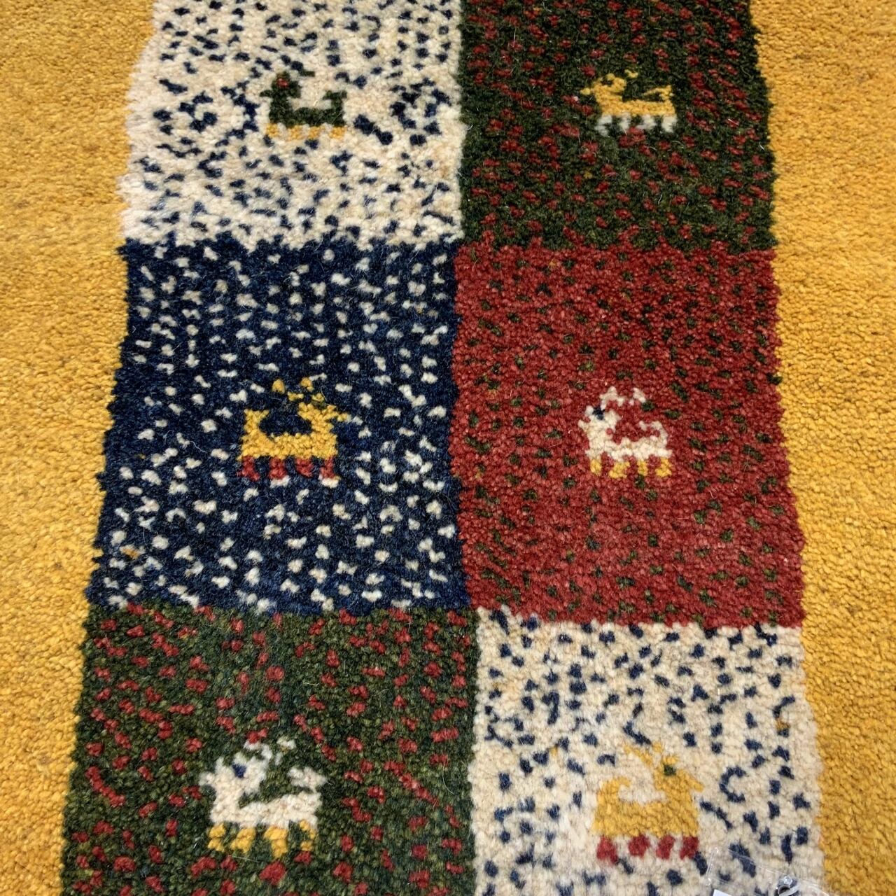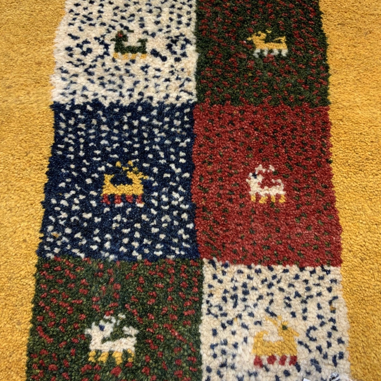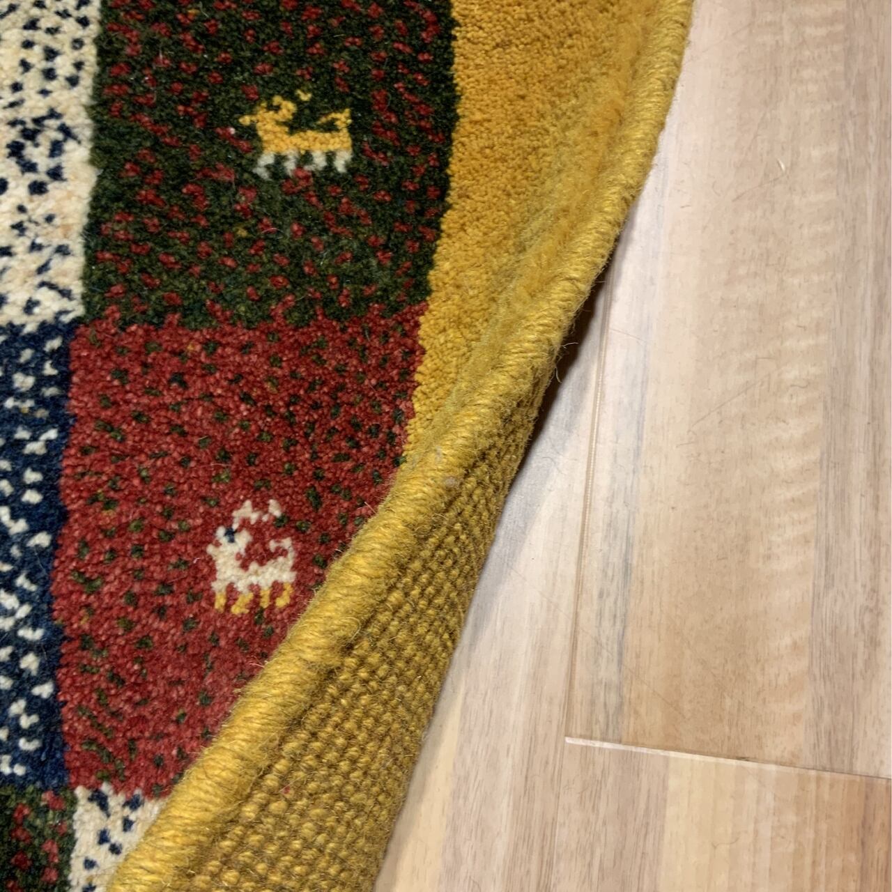 【お手入】 普段のお手入れは掃除機をかけるだけで十分です。使いはじめは遊び毛が出る事もありますが、使っていくうちに徐々に落ち着いてきます。また、天気の良い場所に干したり、敷き場所や方向など定期的に変えたりする事も長持ちの秘訣です。汚れが気になりクリーニングをお考えの場合、大きいサイズのギャッベですと水を含みかなりの重量になりますので、専門店でのクリーニングをお勧めしますが、このサイズでしたら自分で水洗いが出来そうです。その際は、お湯は使わずお水で洗って下さいね。ウール用の洗剤などで柔らかめのブラシで汚れを落として下さい。泡をしっかりと濯いだ後に水けをしっかりとって太陽の下で干して下さい。クリーニングに出される場合は当店でも承りますのでご相談ください。また、長期間使用しないまま保管される場合は、汚れをとり、湿気のない風通しの良い場所に保管して下さい。手織りの絨毯はお手入れ次第で一生あるいは次の世代まで受け継いでいただけます。