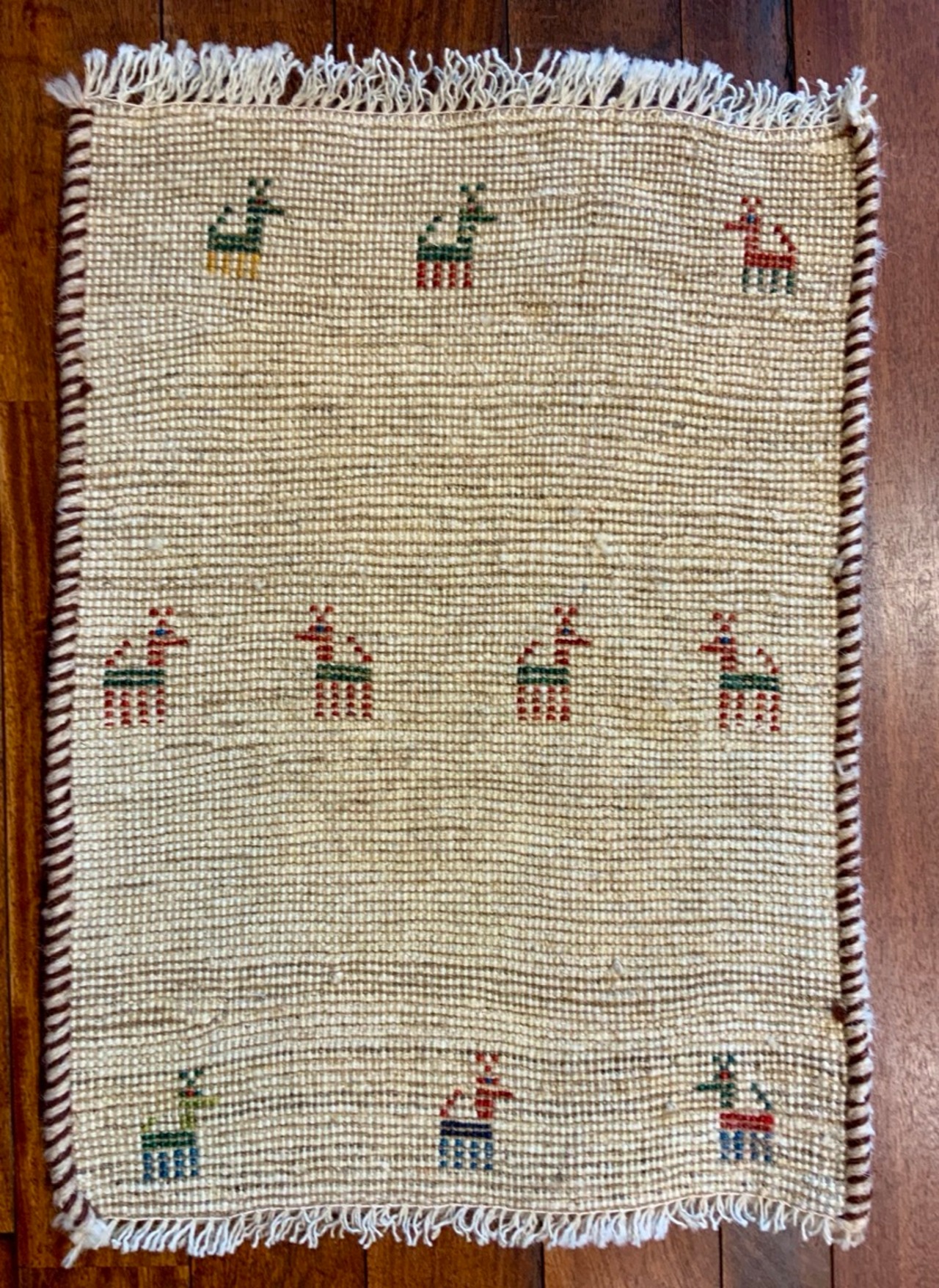 【お手入】 普段のお手入れは掃除機をかけるだけで十分です。使いはじめは遊び毛が出る事もありますが、使っていくうちに徐々に落ち着いてきます。また、天気の良い場所に干したり、敷き場所や方向など定期的に変えたりする事も長持ちの秘訣です。汚れが気になりクリーニングをお考えの場合、大きいサイズのギャッベですと水を含みかなりの重量になりますので、専門店でのクリーニングをお勧めしますが、このサイズでしたら自分で水洗いが出来そうです。その際は、お湯は使わずお水で洗って下さいね。ウール用の洗剤などで柔らかめのブラシで汚れを落として下さい。泡をしっかりと濯いだ後に水けをしっかりとって太陽の下で干して下さい。クリーニングに出される場合は当店でも承りますのでご相談ください。また、長期間使用しないまま保管される場合は、汚れをとり、湿気のない風通しの良い場所に保管して下さい。手織りの絨毯はお手入れ次第で一生あるいは次の世代まで受け継いでいただけます。
