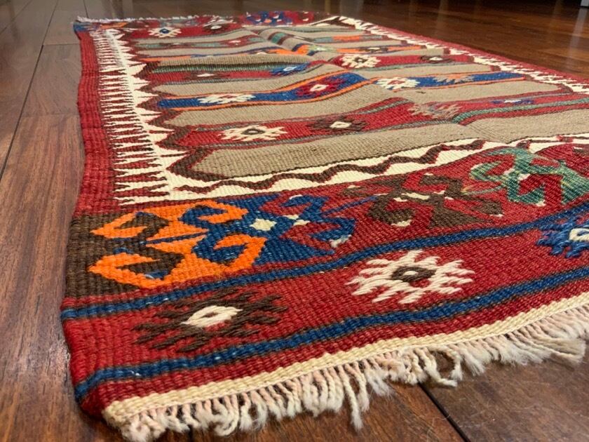 【お手入】 普段のお手入れは掃除機をかけるだけで十分です。天気の良い場所に干したり、敷き場所や方向など定期的に変えたりする事も長持ちの秘訣です。汚れが気になりクリーニングをお考えの場合には、専門店でのクリーニングをお勧めします。当店でも承りますのでご相談ください。また、長期間使用しないまま保管される場合は、汚れをとり、湿気のない風通しの良い場所に保管して下さい。手織りのキリムはお手入れ次第で一生あるいは次の世代まで受け継いでいただけます。