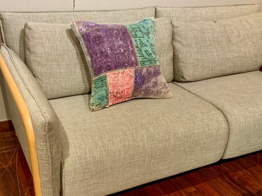 何十年も前に織られたトルコ絨毯を染め直して、毛足を短くした生地をクッションカバーに仕上げました。